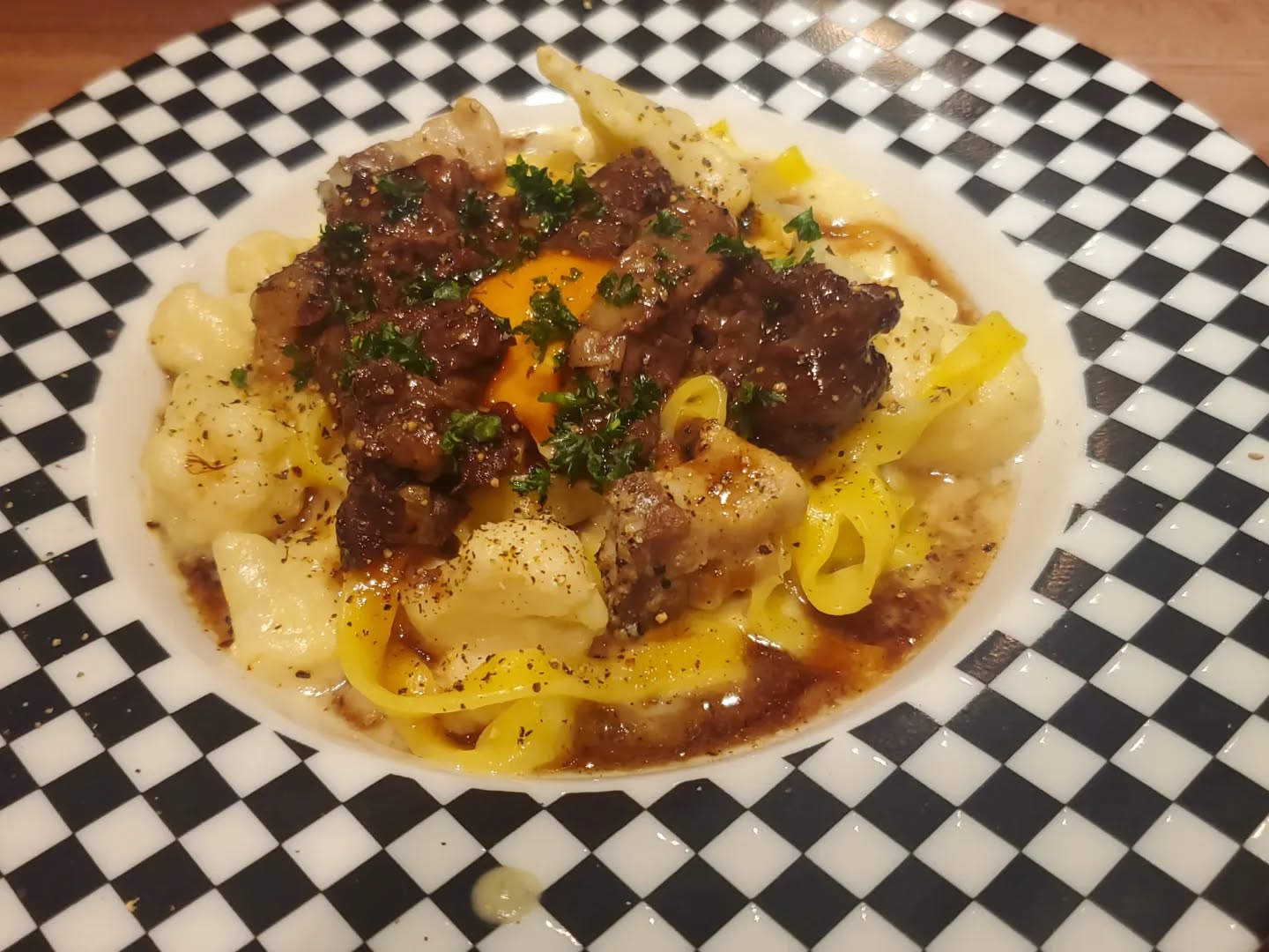 #カリフラワーのカルボナーラ和牛すじ赤ワイン煮添え