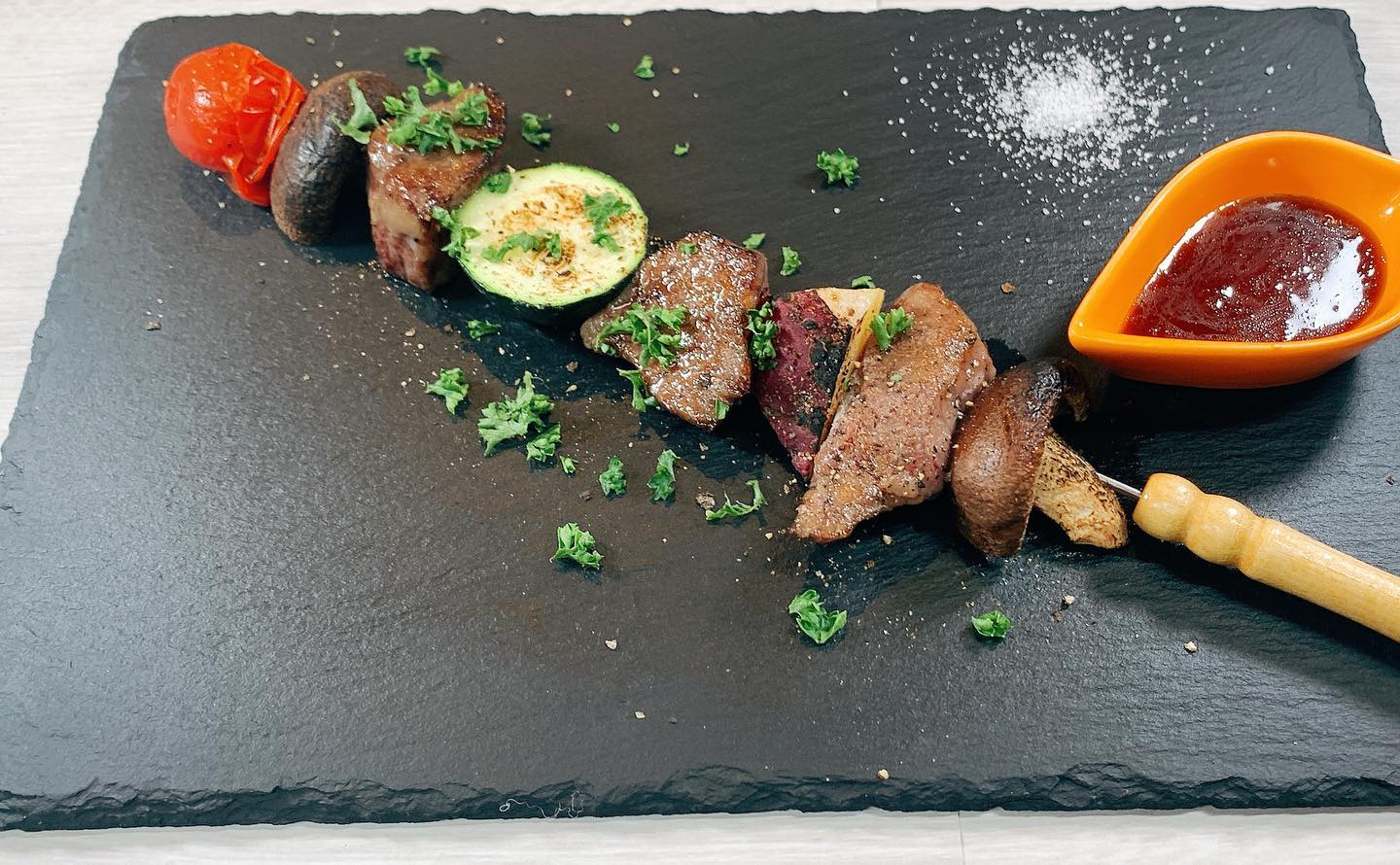 和牛串は、足利産の椎茸やズッキーニをお肉と一緒にさして…